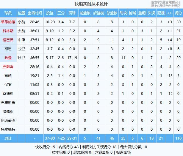 莱昂纳德30分8板3助、哈登29分8板11助、科林斯21分4板1助3帽、祖巴茨19分11板4助、邓恩6分3板2助2断、布朗5分4板、巴图姆4板、保罗2板3助、桑德斯2板1助