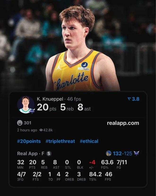 至今为止,克尼佩尔又创下一项NBA历史新秀纪录,他在保持“50/40/90%”命中率(即投篮命中率50%、三分命中率40%、罚球命中率90%)的同时,单场得分20+的比赛场次已超越库里。
